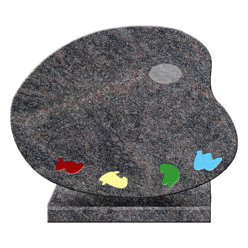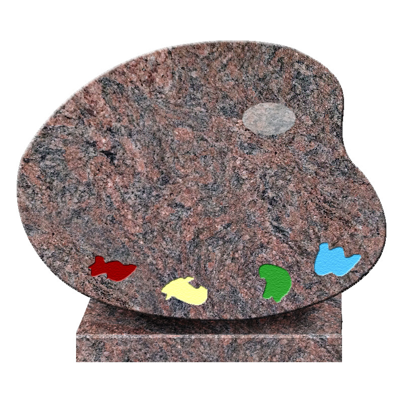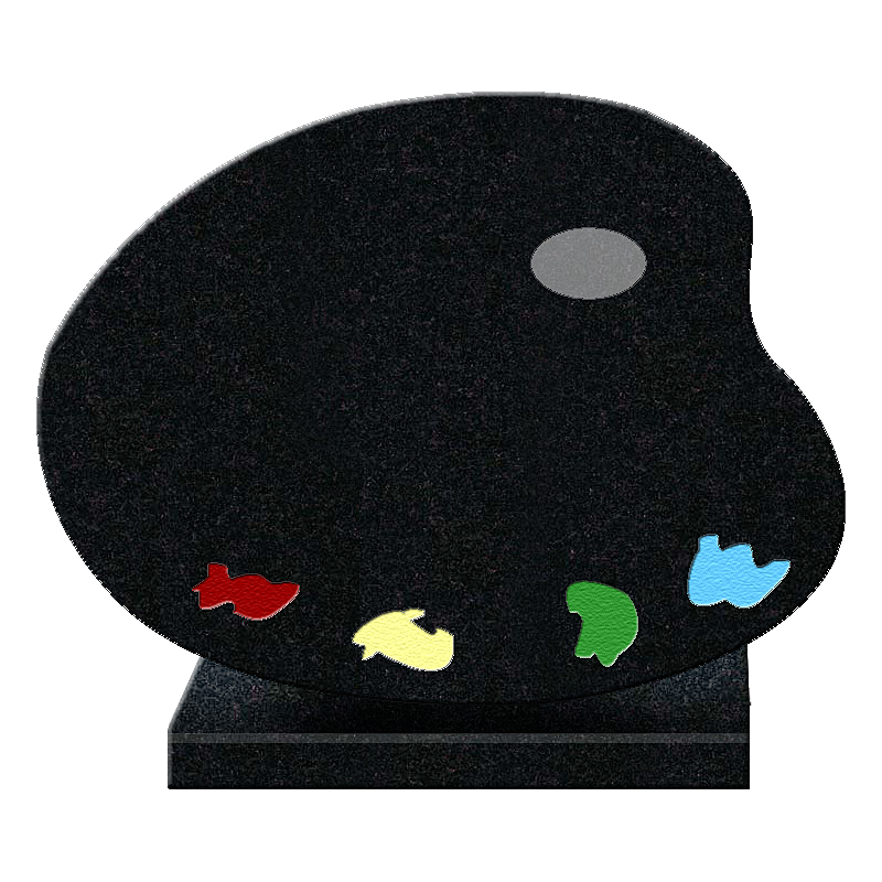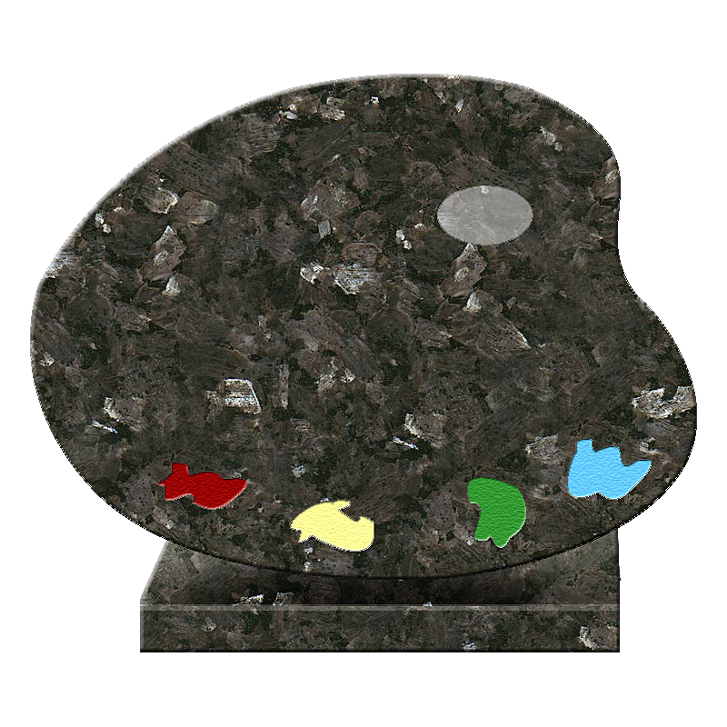 plaque funéraire granit en forme de palette de peintre de 32cm x 24cm sur socle granit de 23cm x 15cm. A personnaliser avec un texte gravé, un motif gravé, un bronze, une photo porcelaine.