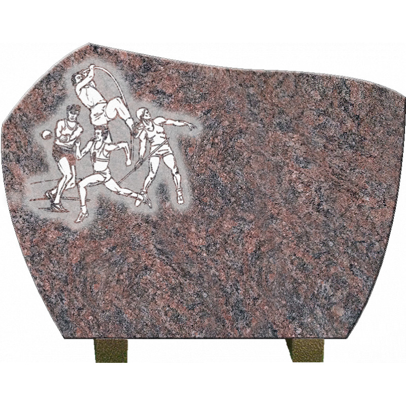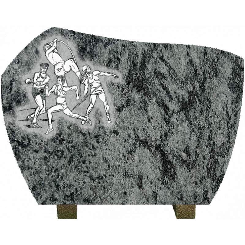 Plaque funéraire granit 30cm x 22cm sur pieds alu et motif athlétisme gravé. A personnaliser avec un texte gravé, un motif gravé, un motif en bronze et une photo porcelaine.